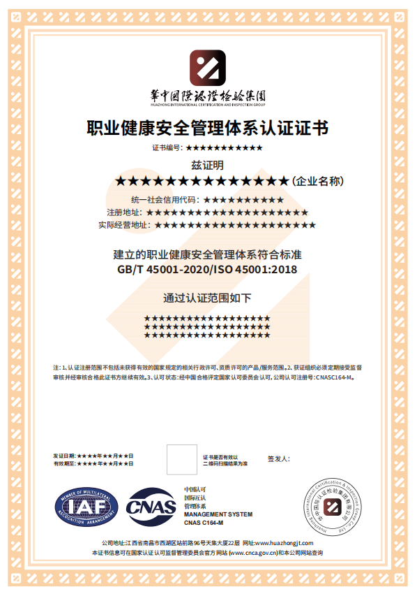 (7)申请组织承诺获得华中国际认证证书后,持续有效运行职业健康安全管理体系,按认证合同约定支付有关费用,按规定接受华中国际和认证监管部门的监督/检查,按华中国际规定使用认证证书、标志和审核报告,并将组织发生的可能影响职业健康安全管理体系持续满足认证标准要求的能力的事宜向华中国际报告。