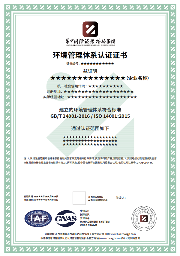 (7)申请组织承诺获得华中国际认证证书后,持续有效运行环境管理体系,按认证合同约定支付有关费用,按规定接受华中国际和认证监管部门的监督/检查,按华中国际规定使用认证证书、标志和审核报告,并将组织发生的可能影响环境管理体系持续满足认证标准要求的能力的事宜向华中国际报告。